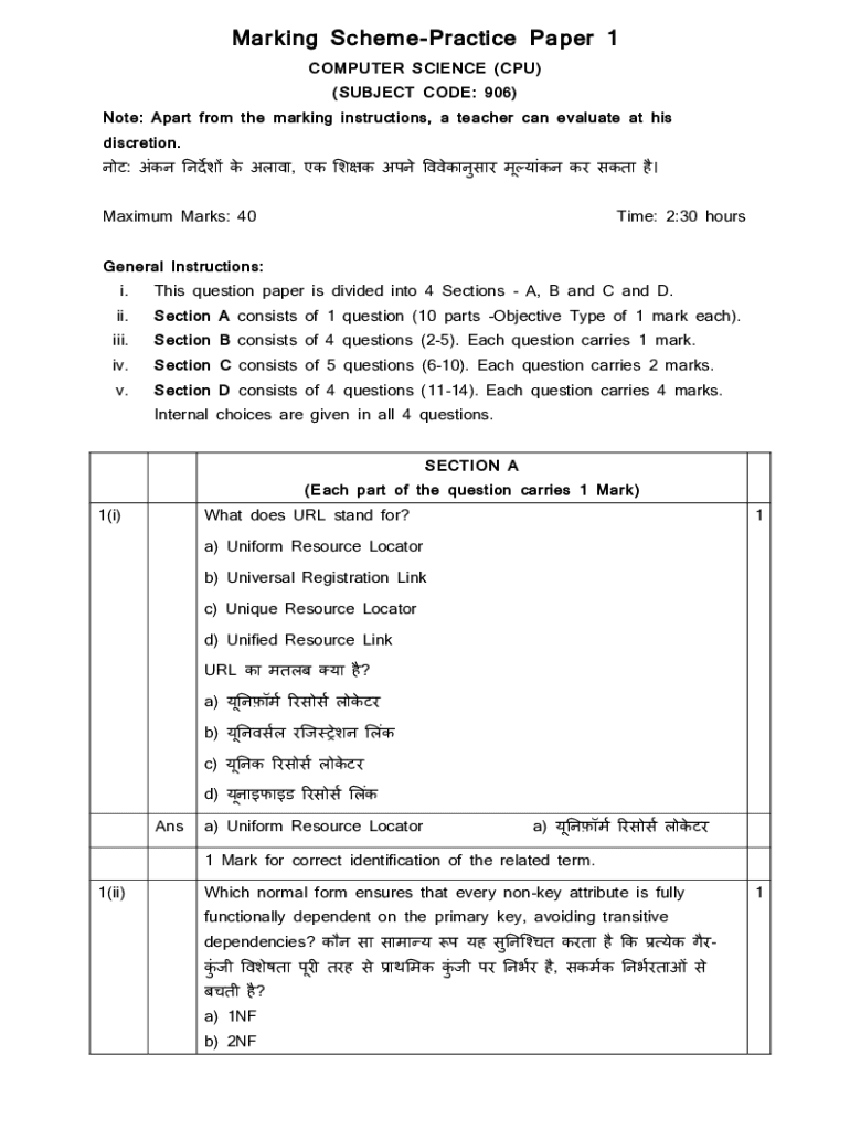 Marking SchemePractice Paper 1 COMPUTER SCIENCE (CPU) (SUBJECT CODE: 906)Note: Apart from the marking instructions, a teacher can evaluate at his discretion.: , Maximum Marks: 40Time: 2:30 hoursGeneral