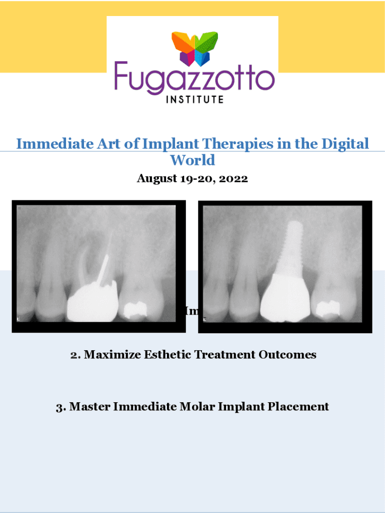 Immediate Art of Implant Therapies in the Digital World August 1920, 20221. Algorithms for Anterior Immediate Implant Placement2. Maximize Esthetic Treatment Outcomes3. Master Immediate Molar Implant