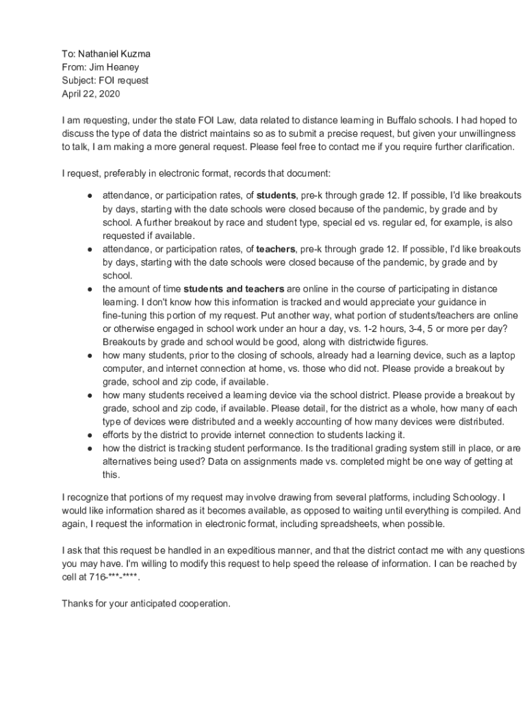 To: Nathaniel Kuzma From: Jim Heaney Subject: FOI request April 22, 2020 I am requesting, under the state FOI Law, data related to distance learning in Buffalo schools. I had hoped to discuss the