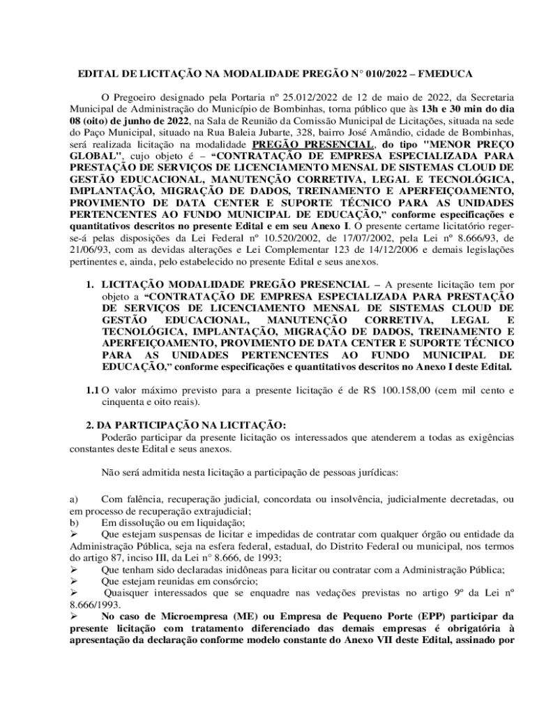 EDITAL DE LICITAO NA MODALIDADE PREGO N 010/2022 FMEDUCA O Pregoeiro designado pela Portaria n 25.012/2022 de 12 de maio de 2022, da Secretaria Municipal de Administrao do Municpio de Bombinhas, torna