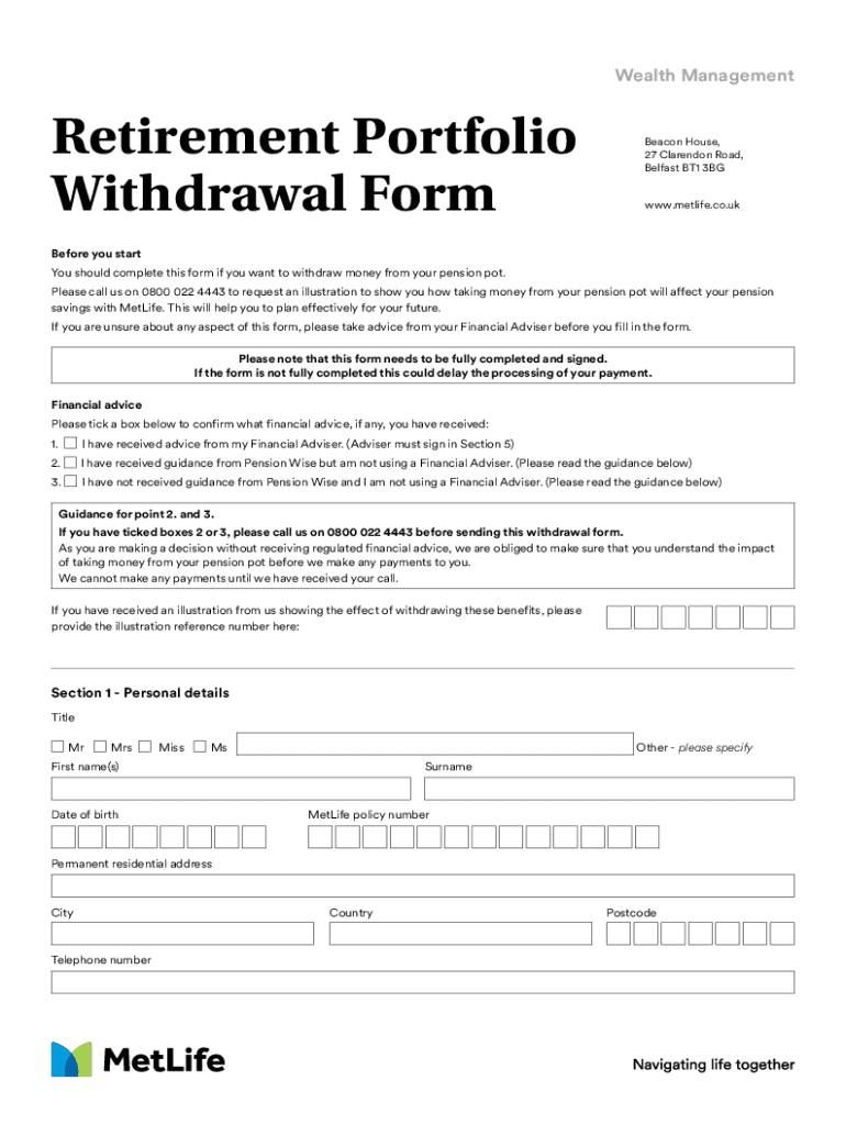Wealth ManagementRetirement Portfolio Withdrawal FormBeacon House, 27 Clarendon Road, Belfast BT1 3BG www.metlife.co.ukBefore you start You should complete this form if you want to withdraw money