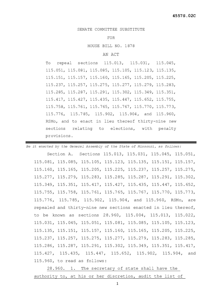 4557S.02C SENATE COMMITTEE SUBSTITUTE FOR HOUSE BILL NO. 1878AN ACT Torepealsections115.013,115.031,115.045,115.051, 115.081, 115.085, 115.105, 115.123, 115.135, 115.151, 115.157, 115.160, 115.165,