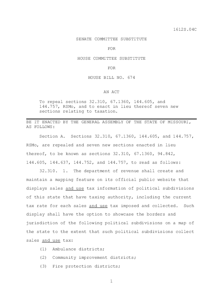 1612S.04C SENATE COMMITTEE SUBSTITUTE FOR HOUSE COMMITTEE SUBSTITUTE FOR HOUSE BILL NO. 674 AN ACT To repeal sections 32.310, 67.1360, 144.605, and 144.757, RSMo, and to enact in lieu thereof seven