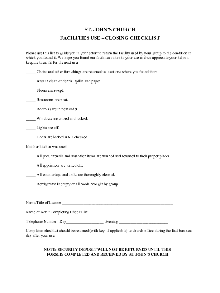 ST. JOHNS CHURCH FACILITIES USE CLOSING CHECKLIST Please use this list to guide you in your effort to return the facility used by your group to the condition in which you found it. We hope you found