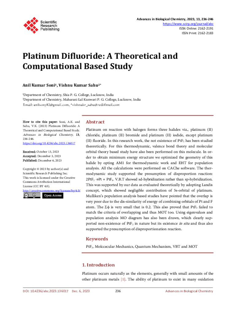 Advances in Biological Chemistry, 2023, 13, 236246 https://www.scirp.org/journal/abc ISSN Online: 21622191 ISSN Print: 21622183Platinum Difluoride: A Theoretical and Computational Based Study Anil