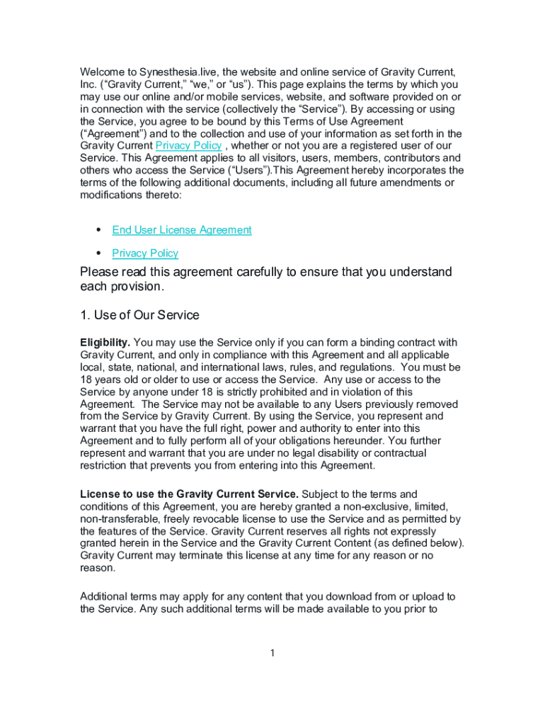 Welcome to Synesthesia.live, the website and online service of Gravity Current, Inc. (Gravity Current, we, or us). This page explains the terms by which you may use our online and/or mobile services,