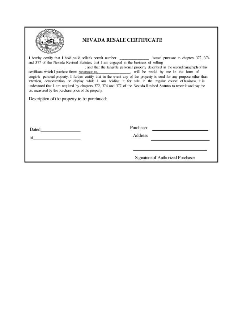 NEVADA RESALE CERTIFICATE I hereby certify that I hold valid seller\'s permit number ___ issued pursuant to chapters 372, 374 and 377 of the Nevada Revised Statutes; that I am engaged in the business