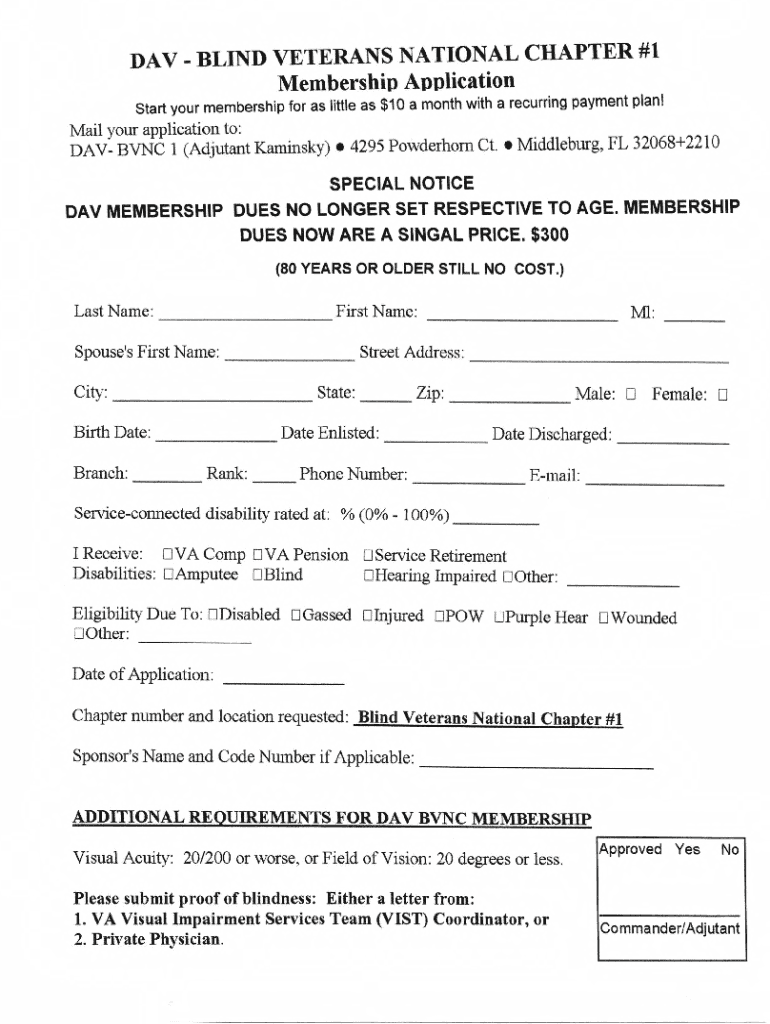 DAV BLIND VETERANS NATIONAL CHAPTER #1 Membership Application Start your membership for as little as $10 a month with a recurring payment plan!Mail your application to: DAV BVNC 1 (Adjutant Kaminsky)