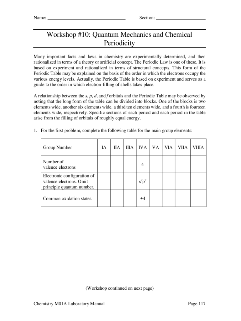 Name: ___Section: ___Workshop #10: Quantum Mechanics and Chemical Periodicity Many important facts and laws in chemistry are experimentally determined, and then rationalized in terms of a theory or