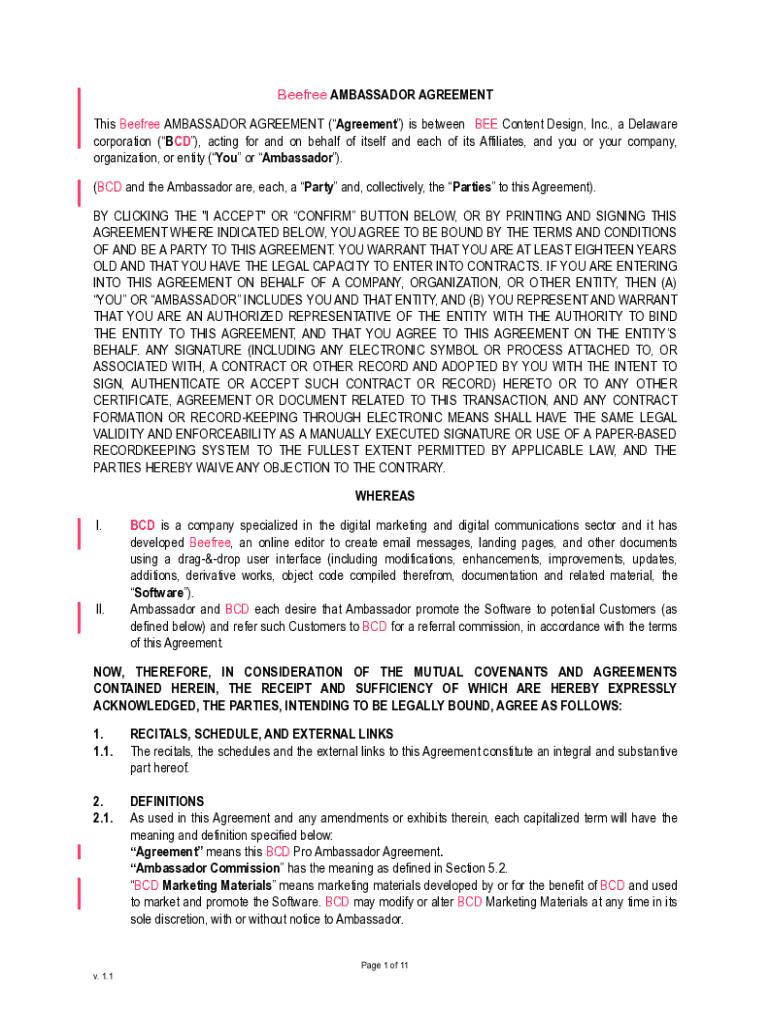 Beefree AMBASSADOR AGREEMENT This Beefree AMBASSADOR AGREEMENT (Agreement) is between BEE Content Design, Inc., a Delaware corporation (BCD), acting for and on behalf of itself and each of its Affiliates,