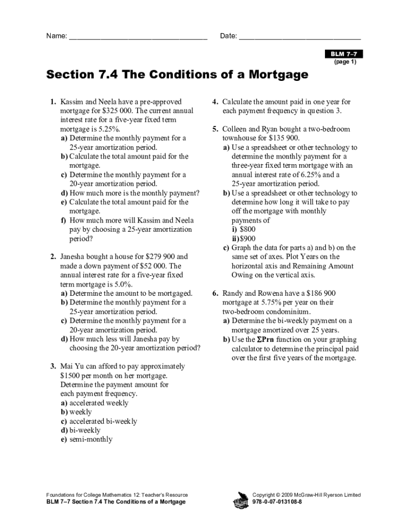 Name: ___Date: ___ BLM 77... (page 1)Section 7.4 The Conditions of a Mortgage 1. Kassim and Neela have a preapproved mortgage for $325 000. The current annual interest rate for a fiveyear fixed term