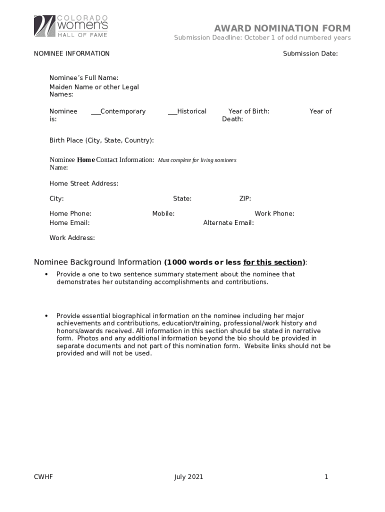 The NOMINEE INATIONSubmission Date: is a document required to be submitted to the specific address in order to provide certain information. It has to be completed and signed, which can be done manually, or by using a certain solution e. g. PDFfiller. It lets you fill out any PDF or Word document directly in your browser, customize it depending on your purposes and put a legally-binding electronic signature. Right after completion, you can easily send the NOMINEE INATIONSubmission Date: to the appropriate recipient, or multiple individuals via email or fax. The template is printable too due to PDFfiller feature and options proposed for printing out adjustment. Both in electronic and in hard copy, your form should have a neat and professional appearance. You may also turn it into a template to use it later, without creating a new blank form over and over. All you need to do is to edit the ready sample.
