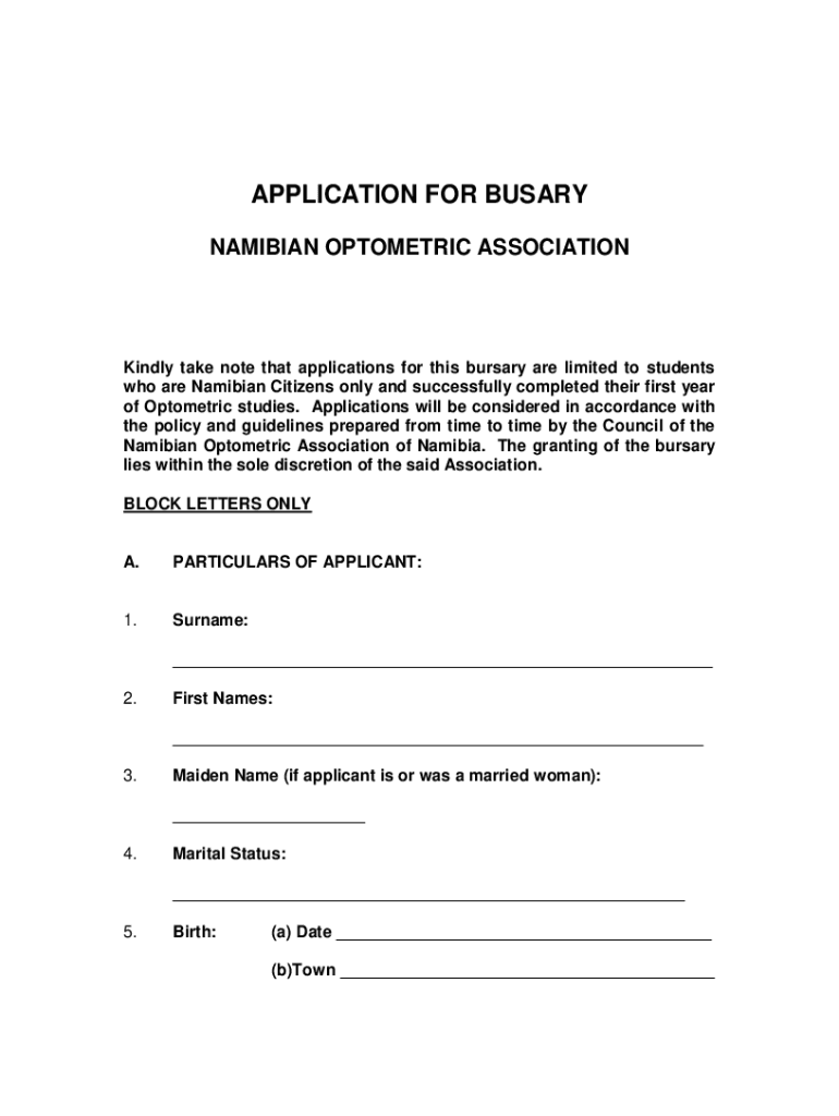APPLICATION FOR BUSARY NAMIBIAN OPTOMETRIC ASSOCIATIONKindly take note that applications for this bursary are limited to students who are Namibian Citizens only and successfully completed their first