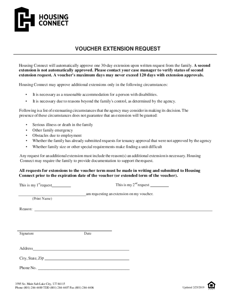 VOUCHER EXTENSION REQUEST Housing Connect will automatically approve one 30day extension upon written request from the family. A second extension is not automatically approved. Please contact your