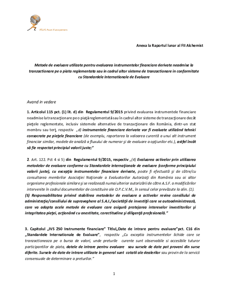 Anexa la Raportul lunar al FII AlchemistMetode de evaluare utilizate pentru evaluarea instrumentelor financiare derivate neadmise la tranzactionare pe o piata reglementata sau in cadrul altor sisteme