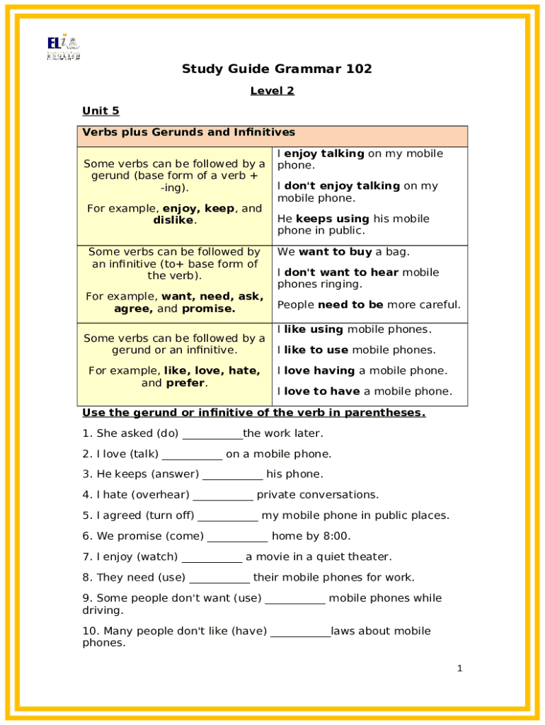 The 102 Study Guide Grammar - kau edu is a writable document required to be submitted to the required address to provide some information. It needs to be filled-out and signed, which may be done manually, or with the help of a certain software such as PDFfiller. It lets you fill out any PDF or Word document directly in your browser, customize it according to your purposes and put a legally-binding electronic signature. Right after completion, you can send the 102 Study Guide Grammar - kau edu to the relevant person, or multiple individuals via email or fax. The blank is printable too from PDFfiller feature and options proposed for printing out adjustment. In both digital and in hard copy, your form should have a clean and professional look. Also you can turn it into a template for further use, there's no need to create a new blank form again. All that needed is to customize the ready document.