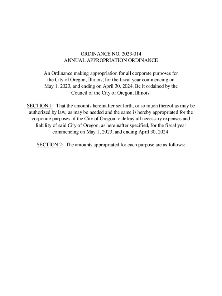 ORDINANCE NO. 2023014 ANNUAL APPROPRIATION ORDINANCE An Ordinance making appropriation for all corporate purposes for the City of Oregon, Illinois, for the fiscal year commencing on May 1, 2023, and