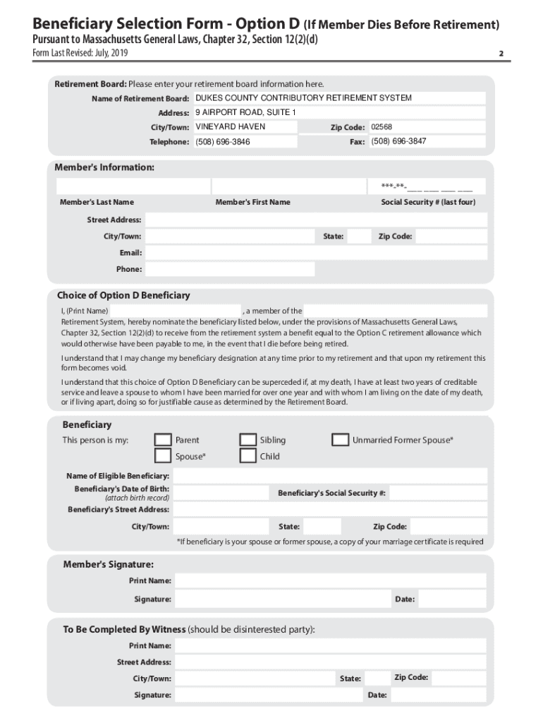 PUBLIC EMPLOYEE RETIREMENT ADMINISTRATION COMMISSION FIVE MIDDLESEX AVENUE, SUITE 304 | SOMERVILLE, MA 02145IntroductionBeneficiary Selection Form Option D (If Member Dies Before Retirement) Pursuant