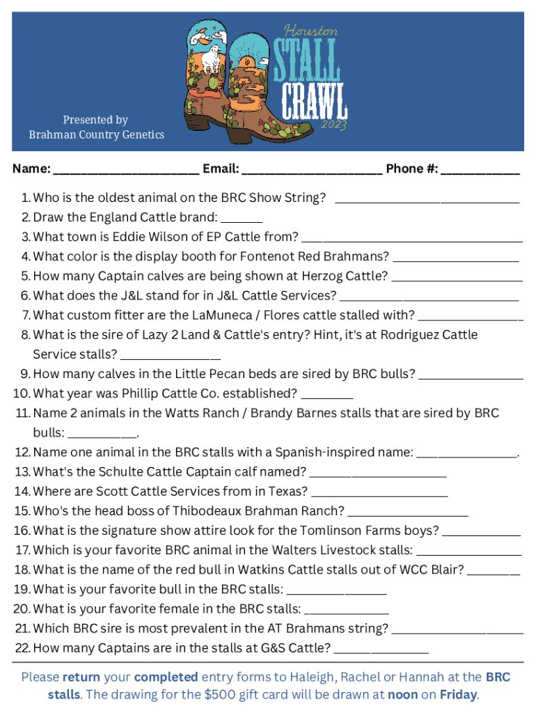 Presented by Brahman Country GeneticsName: ___ Email: ___ Phone #: ___ 1. Who is the oldest animal on the BRC Show String? ___ 2. Draw the England Cattle brand: ___ 3. What town is Eddie Wilson of