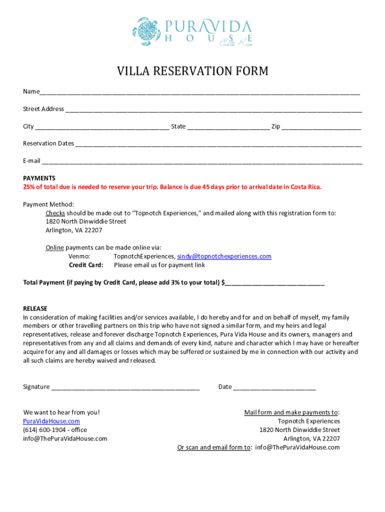 VILLA RESERVATION FORMName___ Street Address ___ City ___ State ___ Zip ___ Reservation Dates ___ Email ___ PAYMENTS 25% of total due is needed to reserve your trip. Balance is due 45 days prior to