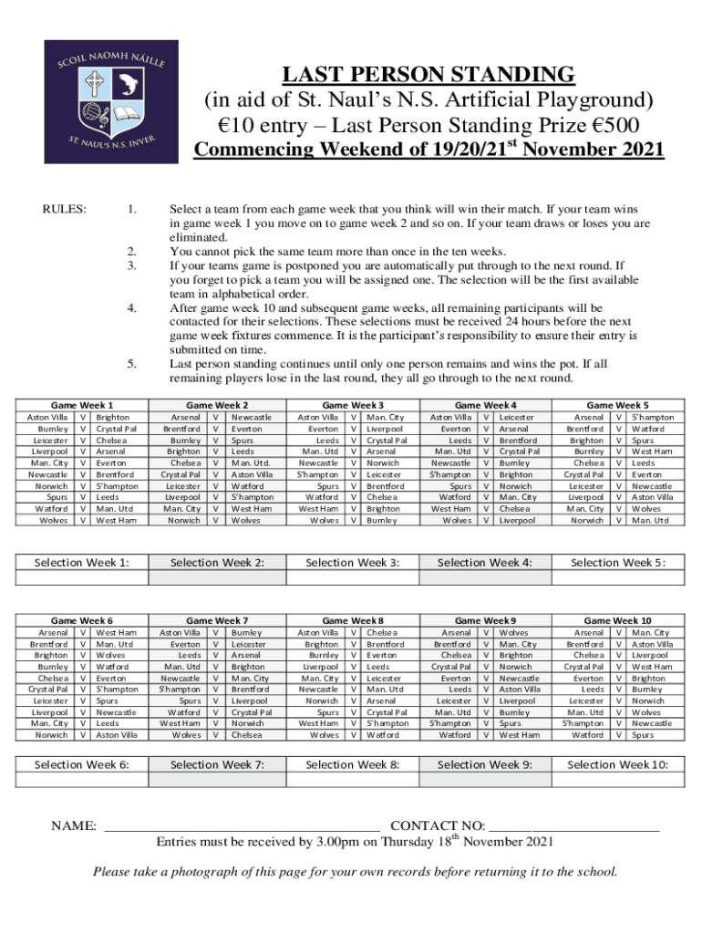 LAST PERSON STANDING (in aid of St. Nauls N.S. Artificial Playground) 10 entry Last Person Standing Prize 500 Commencing Weekend of 19/20/21st November 2021 RULES:1.2. 3.4.5.Game Week 1 Aston Villa