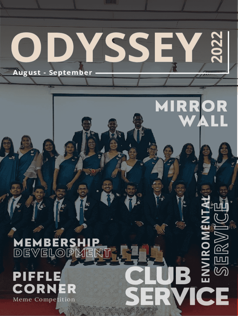 2022ODYSSEY August SeptemberPIFFLE CORNER Meme CompetitionSERVICEMEMBERSHIP DEVELOPMENTENVIROMENTALMIRROR WALLCLUB SERVICE01. President\'s Message 02. Editorial Message 03. Club ServiceLINE UP04.