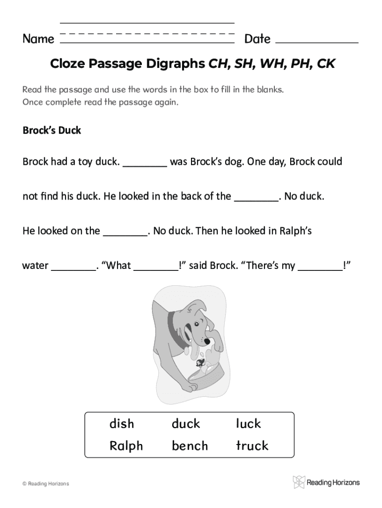 DateNameReading Horizons Discovery Cloze PassagDigraphs e Digraphs CCH, H, SHSH, , WH,WH, PH, CKPH, CK Cloze PassageNameDateRead the passage and use the words in the box to fill in the blanks. Once