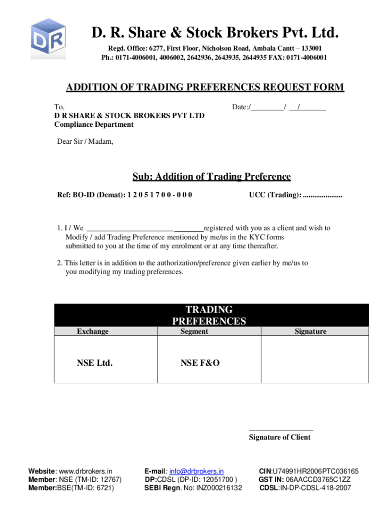 D. R. Share & Stock Brokers Pvt. Ltd. Regd. Office: 6277, First Floor, Nicholson Road, Ambala Cantt 133001 Ph.: 01714006001, 4006002, 2642936, 2643935, 2644935 FAX: 01714006001ADDITION OF TRADING