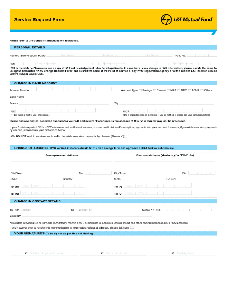 Service Request FormPlease refer to the General Instructions for assistance.Personal Details Name of Sole/First Unit HolderFirst NameMiddle NameFirst Unit HolderPANLast NameSecond Unit HolderFolio