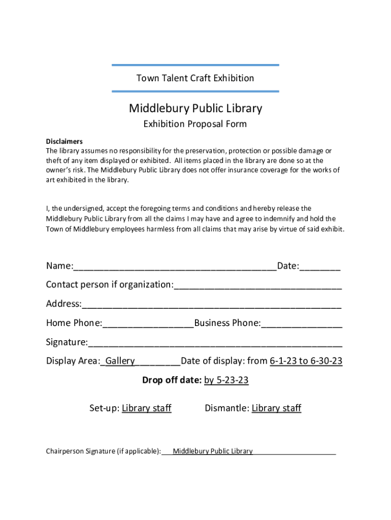 Town Talent Craft ExhibitionMiddlebury Public Library Exhibition Proposal Form Disclaimers The library assumes no responsibility for the preservation, protection or possible damage or theft of any