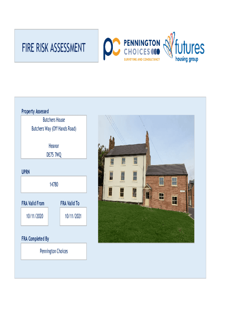 FIRE RISK ASSESSMENTProperty Assessed Butchers House Butchers Way (Off Hands Road) Heanor DE75 7WQ UPRN 14780 FRA Valid From 10/11/2020FRA Valid To 10/11/2021FRA Completed By Pennington ChoicesEXECUTIVE