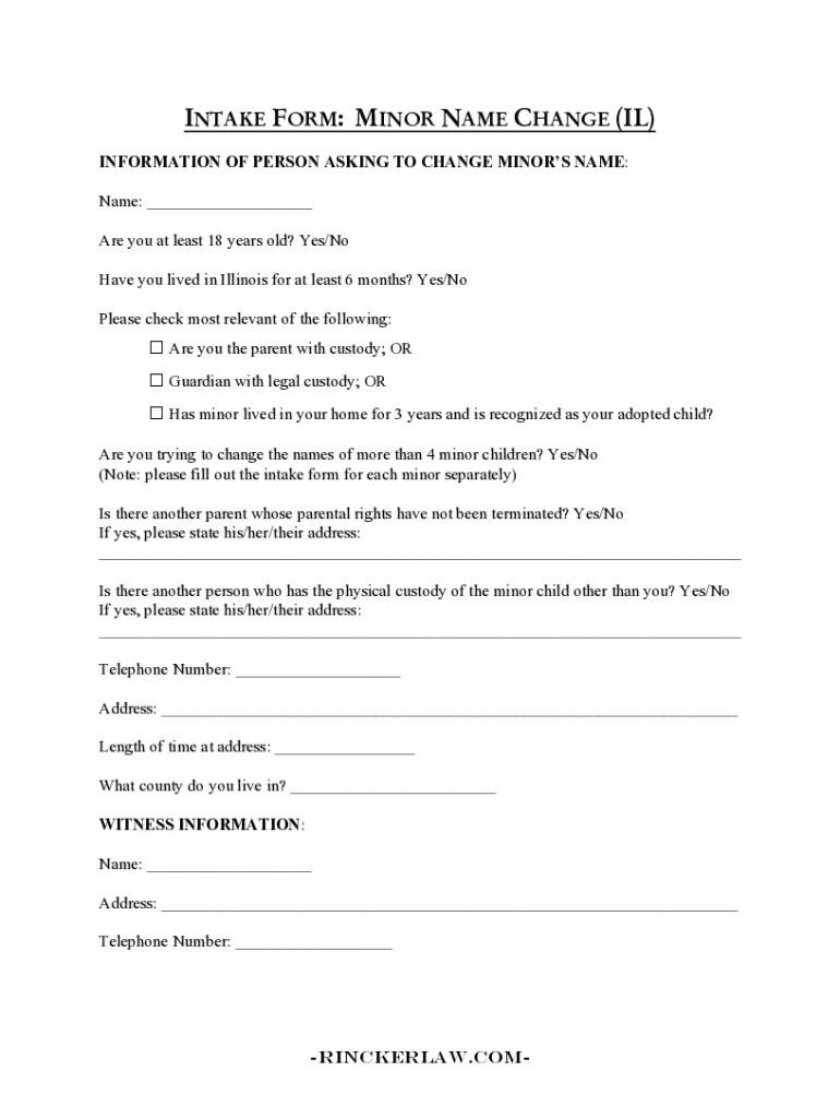 INTAKE FORM: MINOR NAME CHANGE (IL) INFORMATION OF PERSON ASKING TO CHANGE MINORS NAME: Name: ___ Are you at least 18 years old? Yes/No Have you lived in Illinois for at least 6 months? Yes/No Please