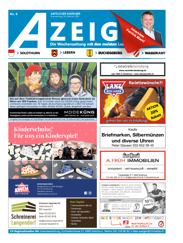 Nr. 8AMTLICHER ANZEIGERDonnerstag, 24. Februar 2022Pa Inte tri rv ck iew M ar tiDie auf dem Titelbild eingekreiste Person gewinnt einen Gutschein im Wert von 100 Franken. Der Gutschein wird von MODE
