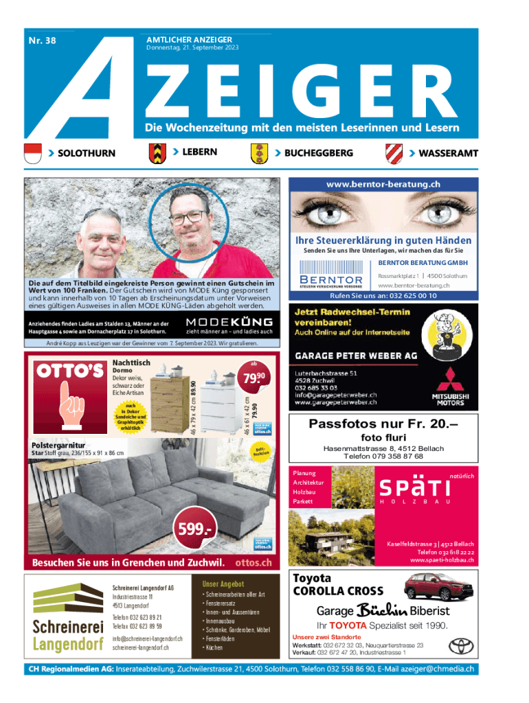Nr. 38AMTLICHER ANZEIGERDonnerstag, 21. September 2023Die auf dem Titelbild eingekreiste Person gewinnt einen Gutschein im Wert von 100 Franken. Der Gutschein wird von MODE Kng gesponsert und kann