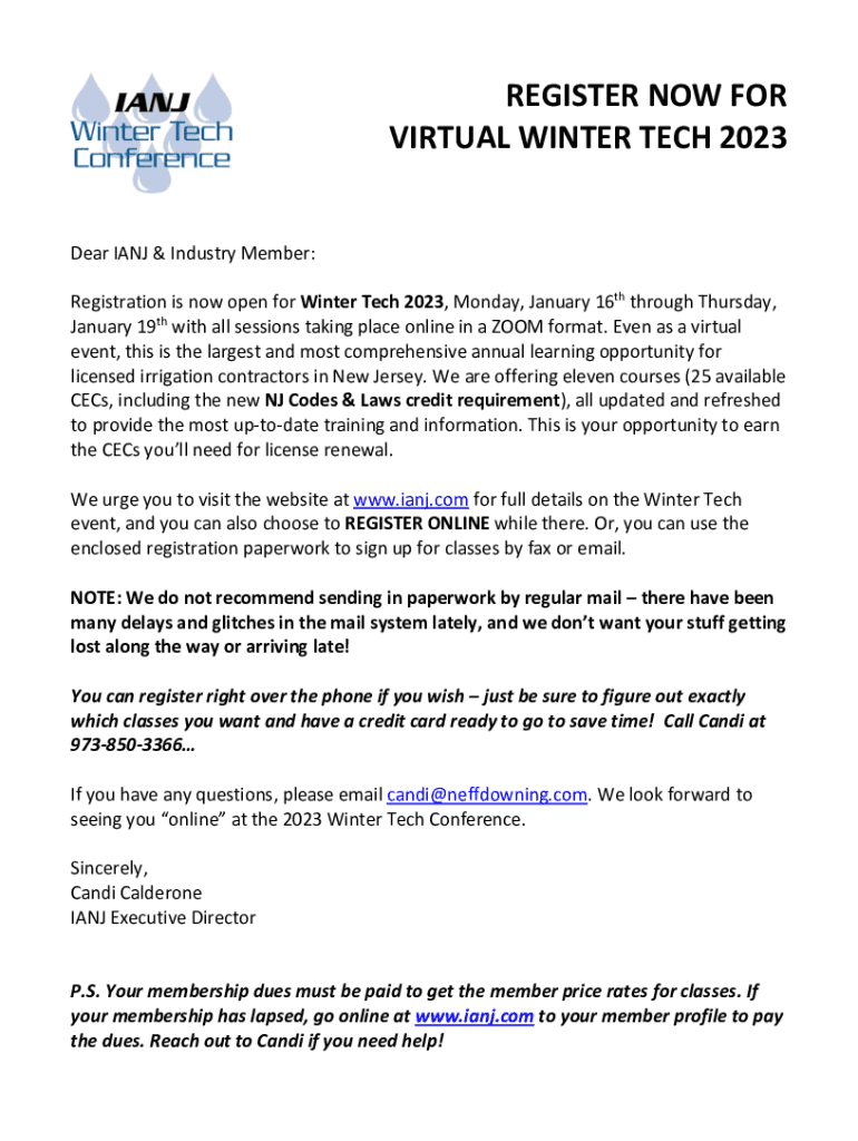REGISTER NOW FOR VIRTUAL WINTER TECH 2023Dear IANJ & Industry Member: Registration is now open for Winter Tech 2023, Monday, January 16th through Thursday, January 19th with all sessions taking place