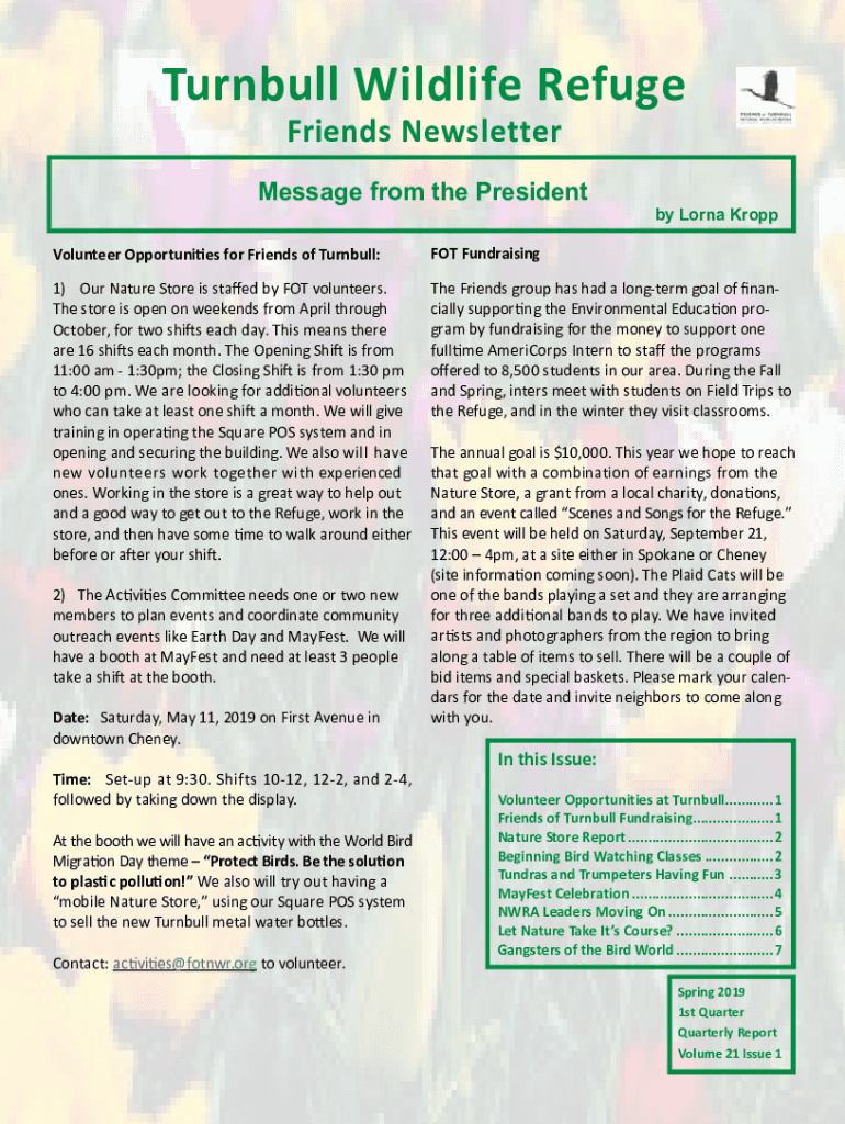 Turnbull Wildlife Refuge Friends NewsletterMessage from the Presidentby Lorna KroppVolunteer Opportunities for Friends of Turnbull:FOT Fundraising1) Our Nature Store is staffed by FOT volunteers.