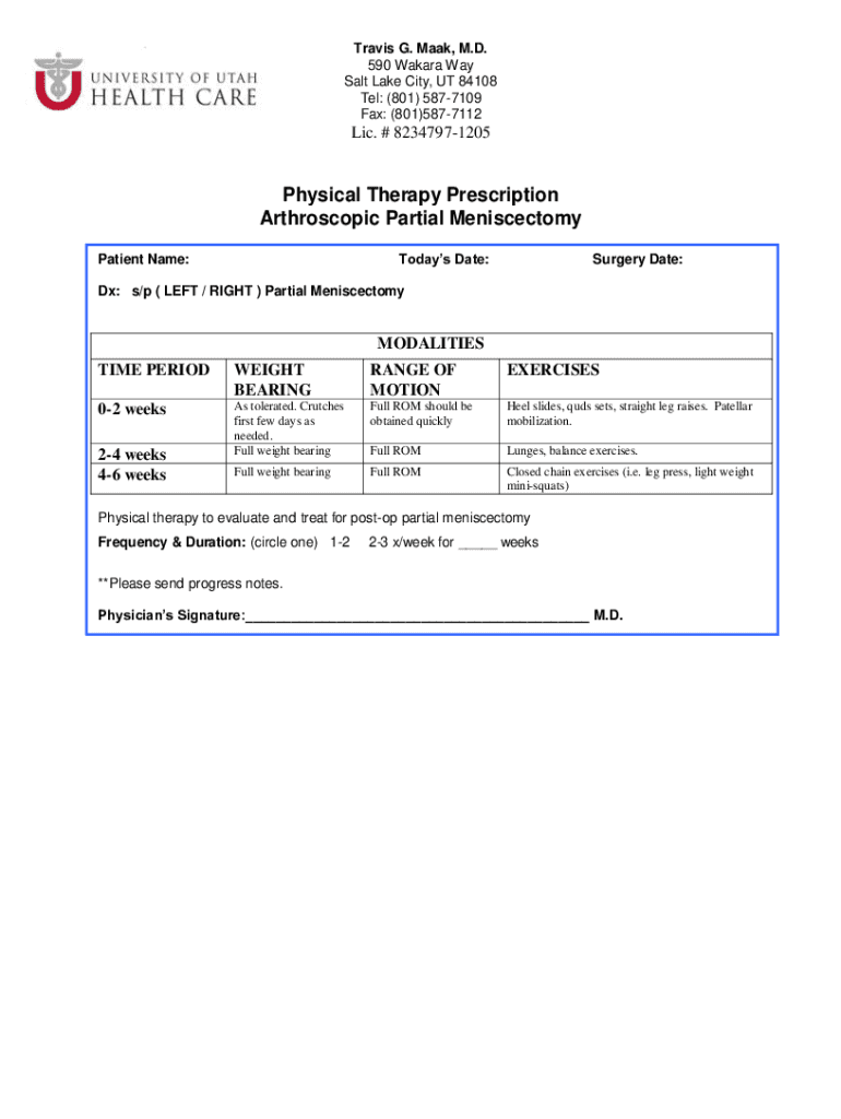 Travis G. Maak, M.D. 590 Wakara Way Salt Lake City, UT 84108 Tel: (801) 5877109 Fax: (801)5877112Lic. # 82347971205Physical Therapy Prescription Arthroscopic Partial Meniscectomy Todays Date:Patient