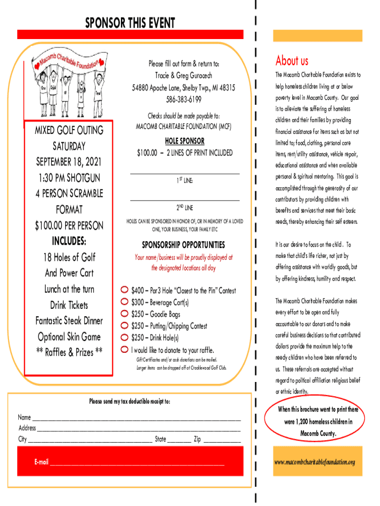 SPONSOR THIS EVENT Please fill out form & return to: Tracie & Greg Guracech 54880 Apache Lane, Shelby Twp., MI 48315 5863836199MIXED GOLF OUTING SATURDAY SEPTEMBER 18, 2021 1:30 PM SHOTGUN 4 PERSON