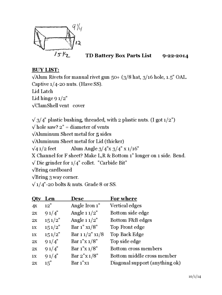 TD Battery Box Parts List9222014BUY LIST: Alum Rivets for manual rivet gun 50+ (3/8 hat, 3/16 hole, 1.5\" OAL. Captive 1/420 nuts. (Have SS). Lid Latch Lid hinge 9 1/2\" ClamShell vent cover 3/4\"