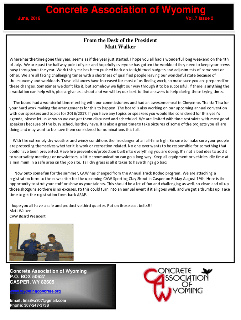 Concrete Association of Wyoming June, 2016Vol. 7 Issue 2From the Desk of the President Matt Walker Where has the time gone this year, seems as if the year just started. I hope you all had a wonderful