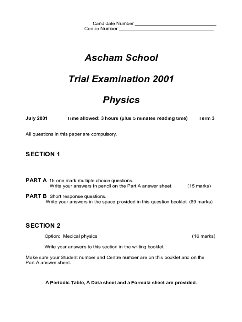 Candidate Number ___ Centre Number ___Ascham School Trial Examination 2001 Physics July 2001Time allowed: 3 hours (plus 5 minutes reading time)Term 3All questions in this paper are compulsory.SECTION