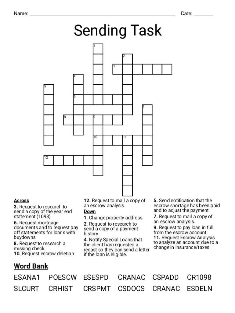 Name: ___ Date: ___Sending Task 1 2 3 4 5 6 7 89101112Across 3. Request to research to send a copy of the year end statement (1098) 6. Request mortgage documents and to request pay off statements