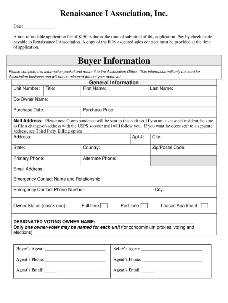 Renaissance I Association, Inc. Date: A nonrefundable application fee of $150 is due at the time of submittal of this application. Pay by check made payable to Renaissance I Association. A copy of