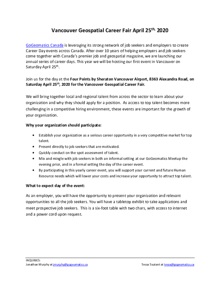 Vancouver Geospatial Career Fair April 25th, 2020 GoGeomatics Canada is leveraging its strong network of job seekers and employers to create Career Day events across Canada. After over 10 years of