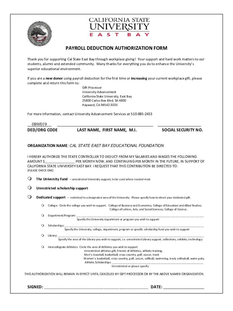 PAYROLL DEDUCTION AUTHORIZATION FORM Thank you for supporting Cal State East Bay through workplace giving! Your support and hard work matters to our students, alumni and extended community. Many thanks
