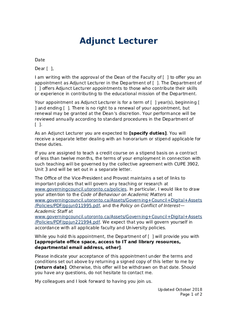 The Guidelines for the Appointment of Status-only, Adjunct and ... is a fillable form in MS Word extension that has to be filled-out and signed for specified reasons. Then, it is provided to the relevant addressee in order to provide some information of certain kinds. The completion and signing is able manually in hard copy or using a suitable solution like PDFfiller. These applications help to submit any PDF or Word file without printing out. It also allows you to edit it for your needs and put legit digital signature. Upon finishing, the user sends the Guidelines for the Appointment of Status-only, Adjunct and ... to the respective recipient or several ones by email or fax. PDFfiller has a feature and options that make your Word template printable. It provides various options for printing out. It doesn't matter how you deliver a form after filling it out - in hard copy or electronically - it will always look neat and firm. To not to create a new document from scratch all the time, turn the original form as a template. After that, you will have an editable sample.