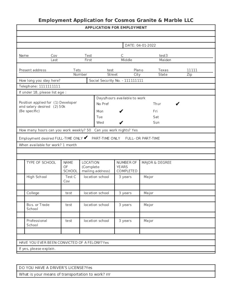 Employment Application for Cosmos Granite & Marble LLC APPLICATION FOR EMPLOYMENTDATE: 04012022 NameCov LastTest FirstPresent addressC MiddleTets NumberHow long you stay here?test Streettest3 Maiden