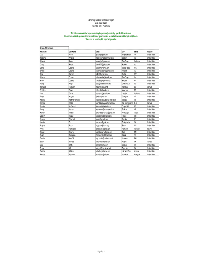 Eden Energy Medicine Certification Program Class 3 and Class 7 November 2011 Phoenix, AZ This list is made available to you exclusively for personally contacting specific fellow students. It is not