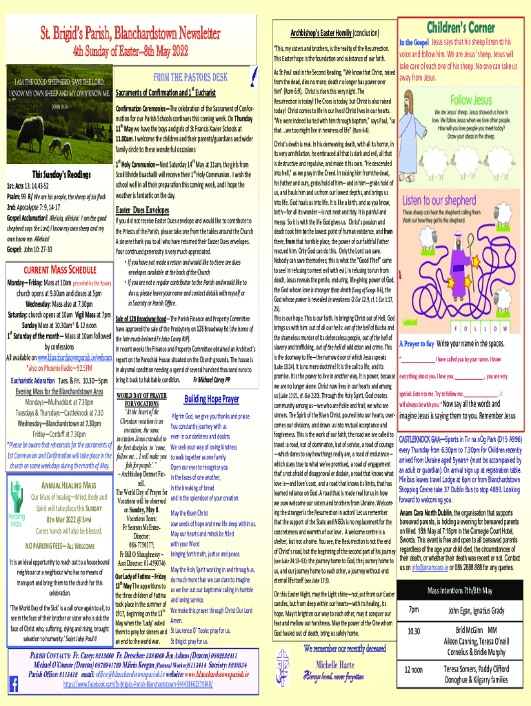 St. Brigids Parish, Blanchardstown Newsletter 4th Sunday of Easter8th May 2022 From the Pastors Desk Sacraments of Confirmation and 1st Eucharist Confirmation CeremoniesThe celebration of the Sacrament