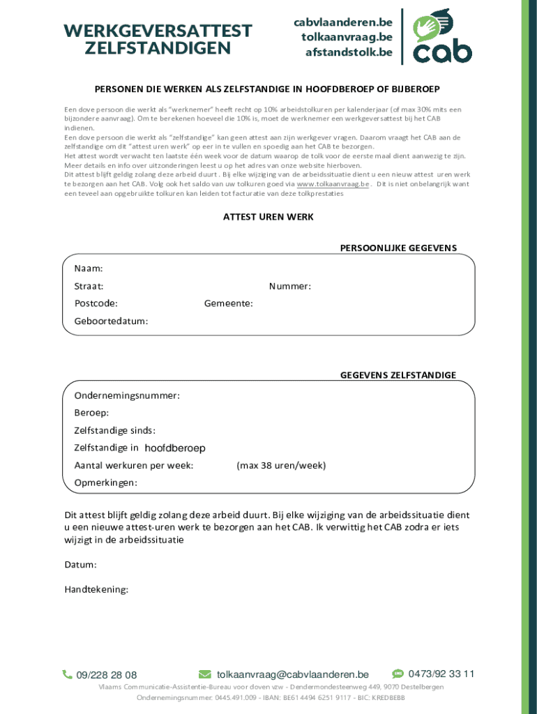 WERKGEVERSATTEST ZELFSTANDIGENcabvlaanderen.be tolkaanvraag.be afstandstolk.bePERSONEN DIE WERKEN ALS ZELFSTANDIGE IN HOOFDBEROEP OF BIJBEROEP Een dove persoon die werkt als werknemer heeft recht
